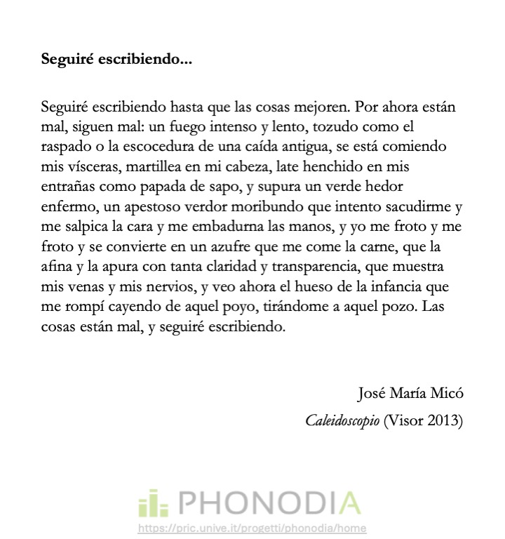 SEGUIRÉ ESCRIBIENDO HASTA QUE LAS COSAS MEJOREN. Por ahora están mal, siguen mal: un fuego intenso y lento, tozudo como el raspado o la escocedura de una caída antigua, se está comiendo mis vísceras, martillea en mi cabeza, late henchido en mis entrañas como papada de sapo, y supura un verde hedor enfermo, un apestoso verdor moribundo que intento sacudirme y me salpica la cara y me embadurna las manos, y yo me froto y me froto y se convierte en un azufre que me come la carne, que la afina y la apura con tanta claridad y transparencia, que muestra mis venas y mis nervios, y veo ahora el hueso de la infancia que me rompí cayendo de aquel poyo, tirándome a aquel pozo. Las cosas están mal, y seguiré escribiendo.
