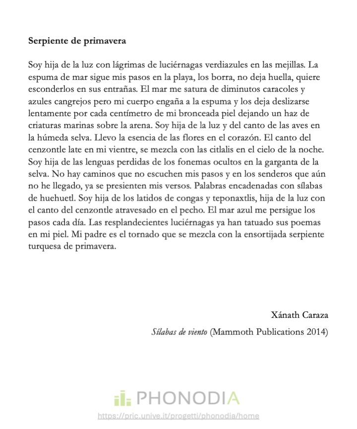 Soy hija de la luz con lágrimas de luciérnagas verdiazules en las mejillas. La espuma de mar sigue mis pasos en la playa, los borra, no deja huella, quiere esconderlos en sus entrañas. El mar me satura de diminutos caracoles y azules cangrejos pero mi cuerpo engaña a la espuma y los deja deslizarse lentamente por cada centímetro de mi bronceada piel dejando un haz de criaturas marinas sobre la arena. Soy hija de la luz y del canto de las aves en la húmeda selva. Llevo la esencia de las flores en el corazón. El canto del cenzontle late en mi vientre, se mezcla con las citlalis en el cielo de la noche. Soy hija de las lenguas perdidas de los fonemas ocultos en la garganta de la selva. No hay caminos que no escuchen mis pasos y en los senderos que aún no he llegado, ya se presienten mis versos. Palabras encadenadas con sílabas de huehuetl. Soy hija de los latidos de congas y teponaxtlis, hija de la luz con el canto del cenzontle atravesado en el pecho. El mar azul me persigue los pasos cada día. Las resplandecientes luciérnagas ya han tatuado sus poemas en mi piel. Mi padre es el tornado que se mezcla con la ensortijada serpiente turquesa de primavera.