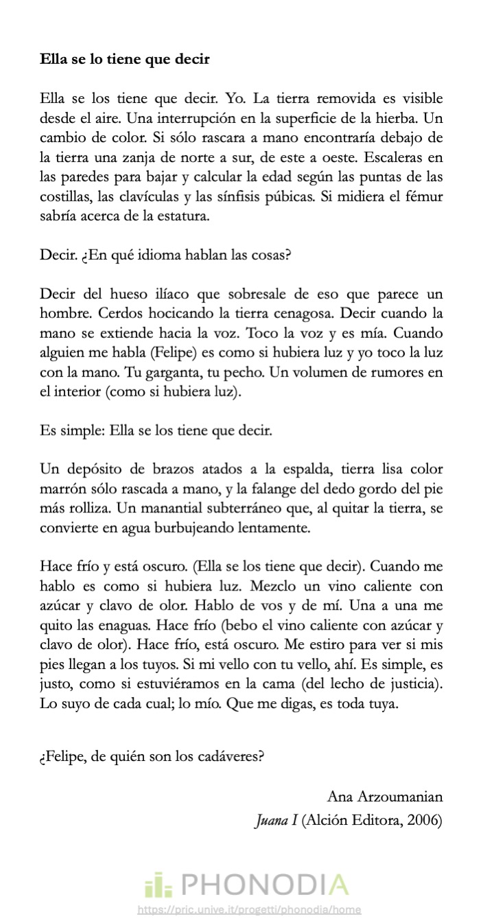 Hace frío y está oscuro. (Ella se los tiene que decir). Cuando me hablo es como si hubiera luz. Mezclo un vino caliente con azúcar y clavo de olor. Hablo de vos y de mí. Una a una me quito las enaguas. Hace frío (bebo el vino caliente con azúcar y clavo de olor). Hace frío, está oscuro. Me estiro para ver si mis pies llegan a los tuyos. Si mi vello con tu vello, ahí. Es simple, es justo, como si estuviéramos en la cama (del lecho de justicia). Lo suyo de cada cual; lo mío. Que me digas, es toda tuya.