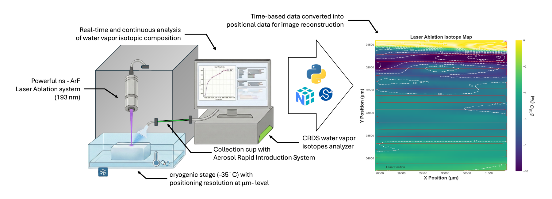 IMAGICS develops a novel approach to high-resolution isotopic imaging that enables unprecedented spatial and temporal reconstruction of climate signals archived in ice. This approach is based on coupling two well-established analytical techniques: Laser Ablation for micro-destructive sampling of geological materials, and Cavity Ring-Down Spectroscopy for stable water isotope analysis.